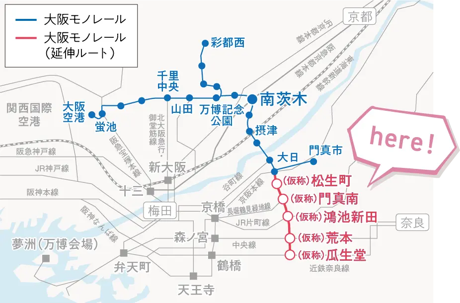 鉄道ネットワークで利便性が向上 - 大阪モノレールは、門真市駅から南へ延伸を予定しております。これにより、JR線・近鉄線など新たに4路線(大阪メトロ長堀鶴見緑地線・JR片町線〈学研都市線〉・近鉄けいはんな線・近鉄奈良線)とつながり、在来鉄道10路線とのネットワークが形成されることでますます便利になっていきます。