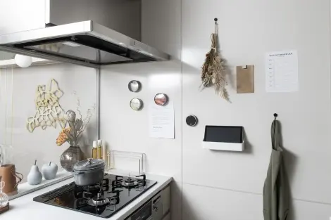 油汚れが付きやすいコンロ周りの壁面には、お手入れが簡単なホーローパネルを採用。マグネットも取り付けられます。
