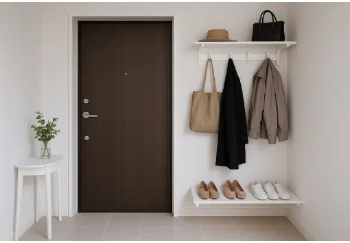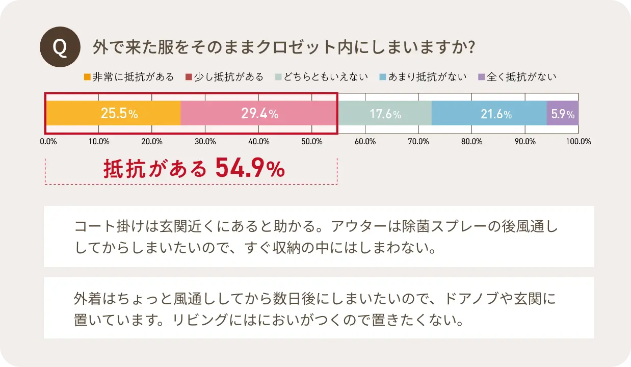 外で着た洋服をそのままクロゼットにしまうのに抵抗がある方が多いというアンケート結果を踏まえ、エントランスにコート掛けなどを設置できる下地補強を施しました。
