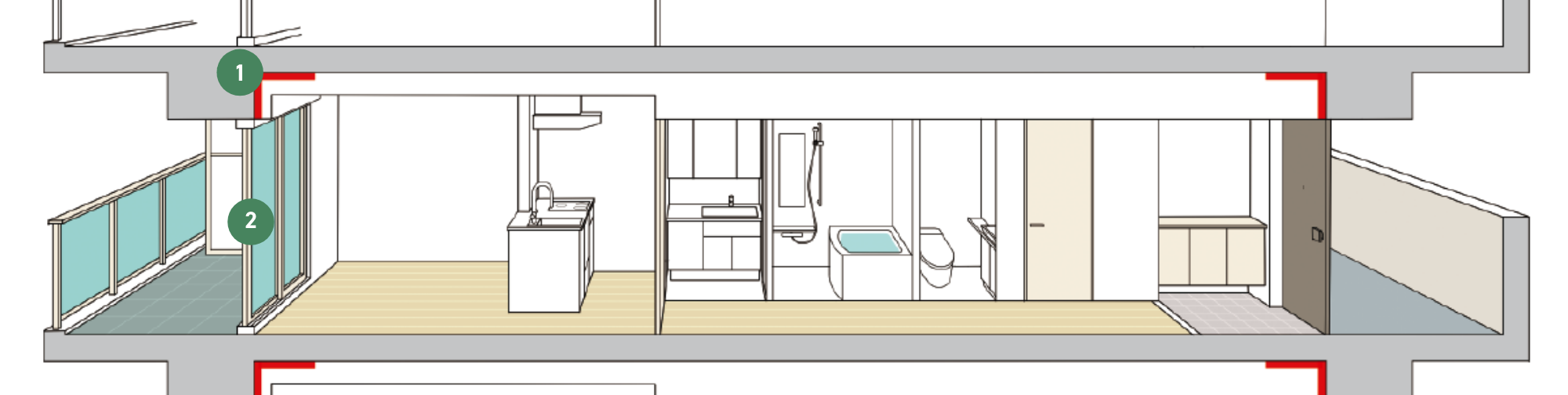 外壁には厚さ約25㎜以上の硬質ウレタンフォーム、住戸最下階スラブ下には厚さ約25〜80㎜のフェノールフォーム断熱材を打込。(一部除く)屋根スラブ上には厚さ約50㎜の断熱材を採用(一部除く)。高い断熱効果を実現します。