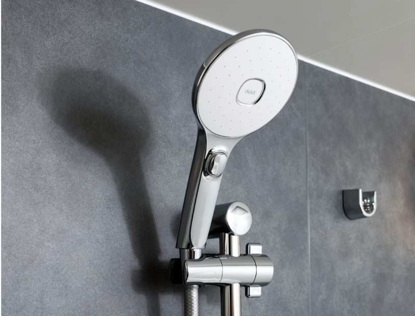 シャワーヘッド本体の手元ボタンで吐水・止水の調整ができる節水シャワーです。