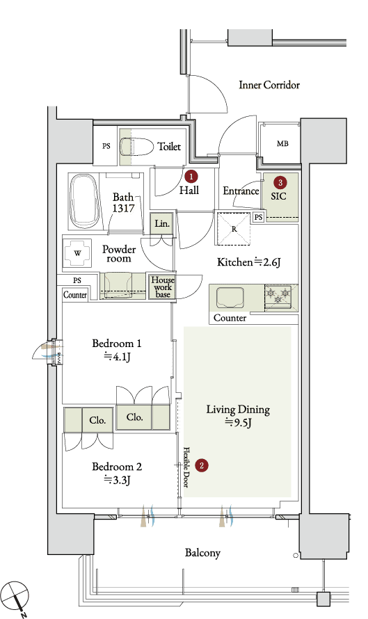 エントランスから一歩踏み入れたその瞬間から上質なくつろぎを予感させる内廊下設計を採用。天候の影響を受けず一年を通して気温の変化が少ないため、私邸へのアプローチが快適に保たれます。