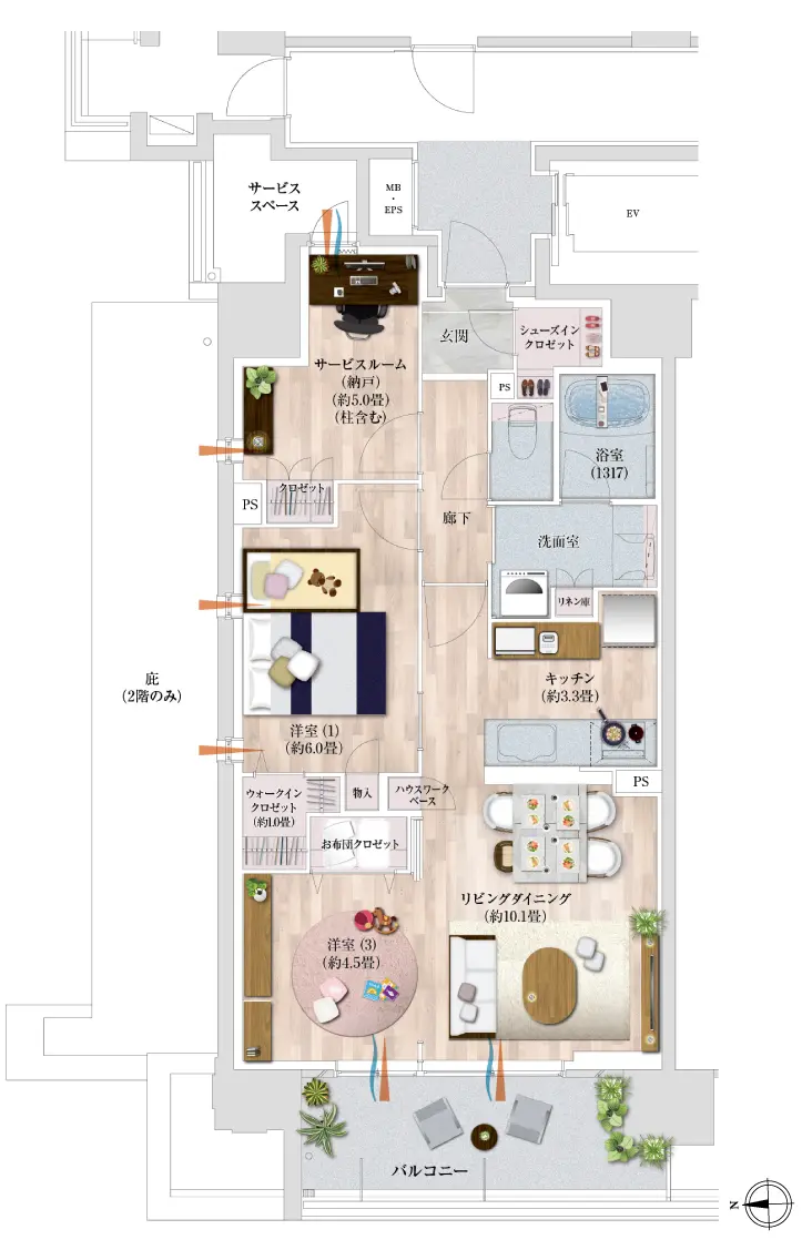 サービススペース面積/3.9㎡(2〜5階)/3.6㎡(6階)