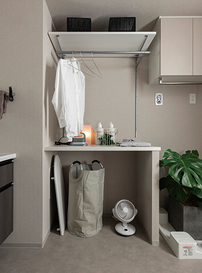 洗面室での家電使用に配慮したコンセントを設置。アイロン、ハンドスチーマーなどを、使いたい時にさっと利用できます。
