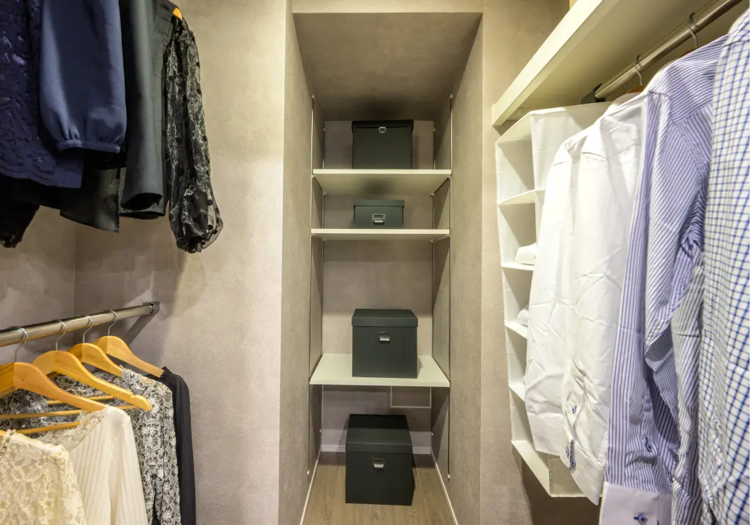 約1.9畳のウォークインクロゼットには、上下2段や枕棚付きなど使いやすさにこだわったハンガーパイプに加え、可動棚スペースもご用意。洋服やバッグ、小物までしまいたいものに合わせてすっきり収納できます。