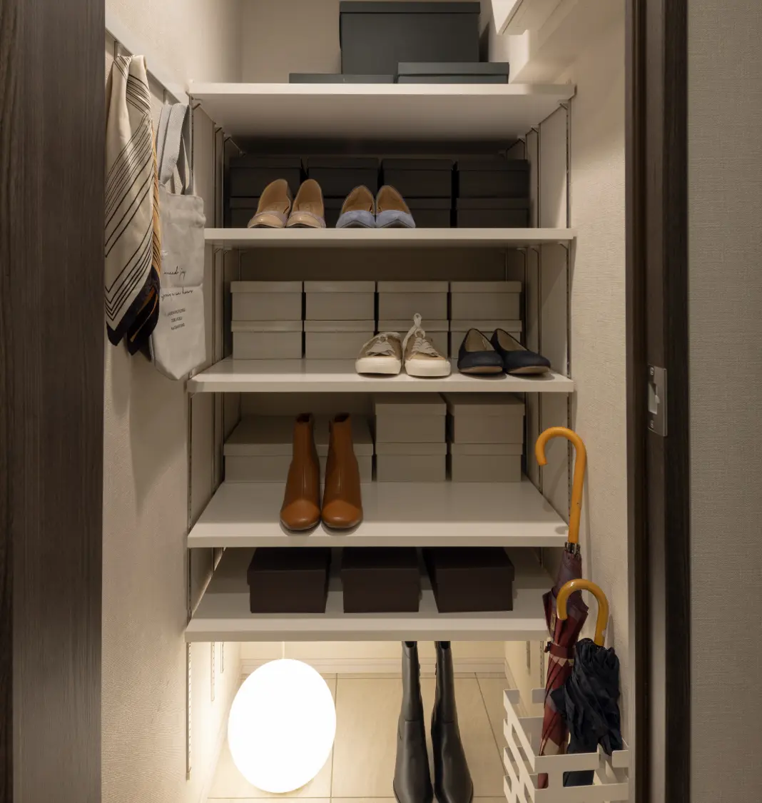 ヒールの高い靴やブーツなどに合わせ、自由に変えることができる可変棚を採用。奥行きもあるため普段使わないものもすっきり収納できます。