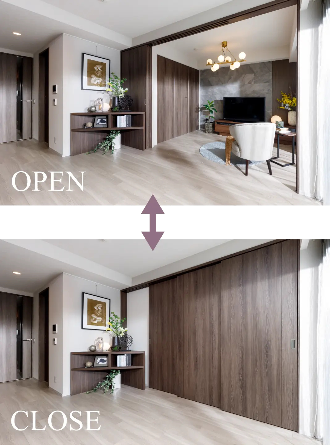 リビング・ダイニングと一体に使うことができるフレキシブルドアを採用。急な来客の際にサッと閉めたりとフレキシブルに間取りを変えられます。
