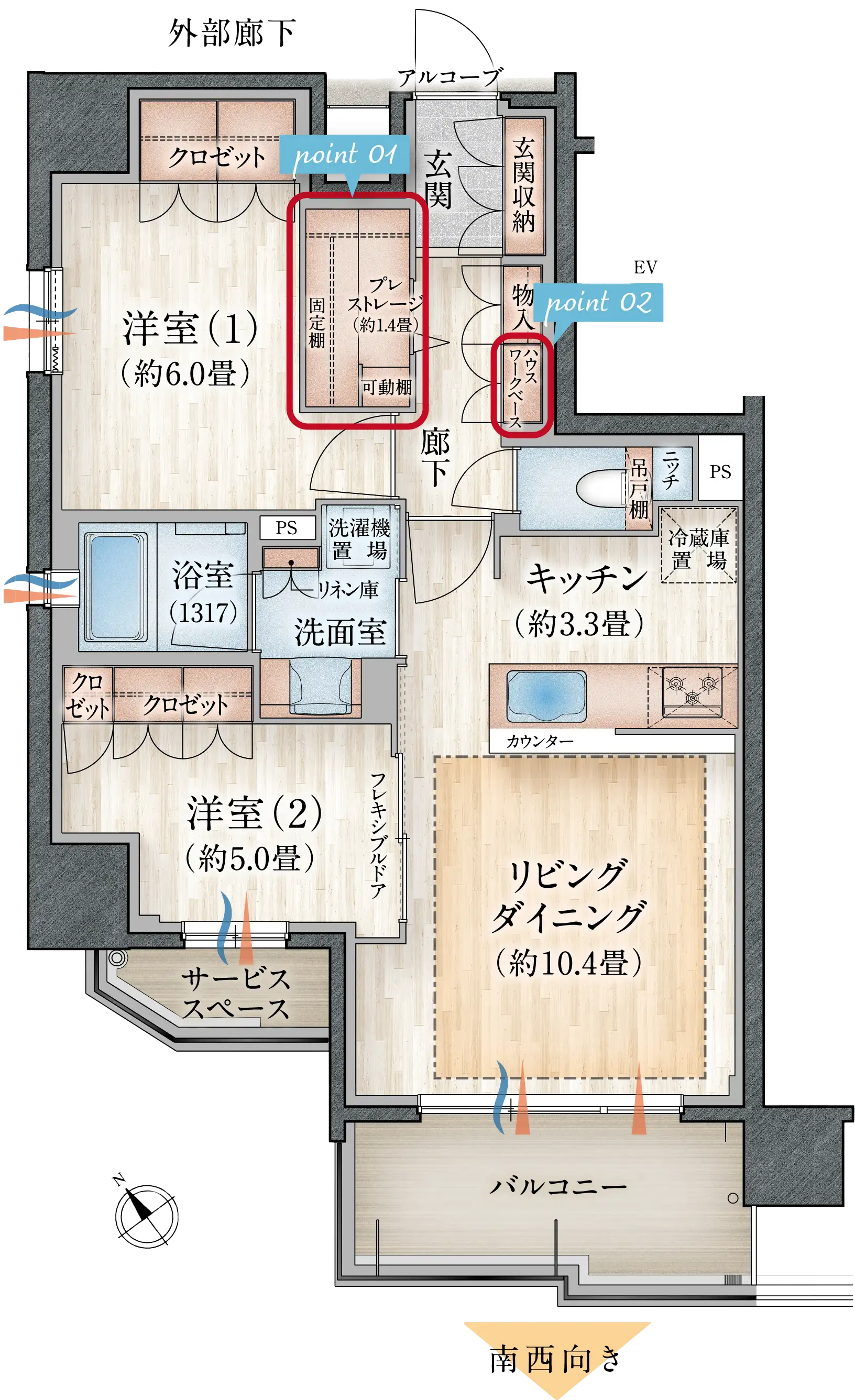 サービススペース面積:1.9m² アルコーブ面積:0.5m²