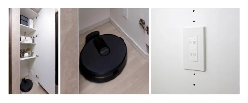 掃除機は意外と収納場所に困るもの。収納内にコンセントを設け、さらに扉の下部をカットしてお掃除ロボットが充電ステーションに戻れるようにしています。