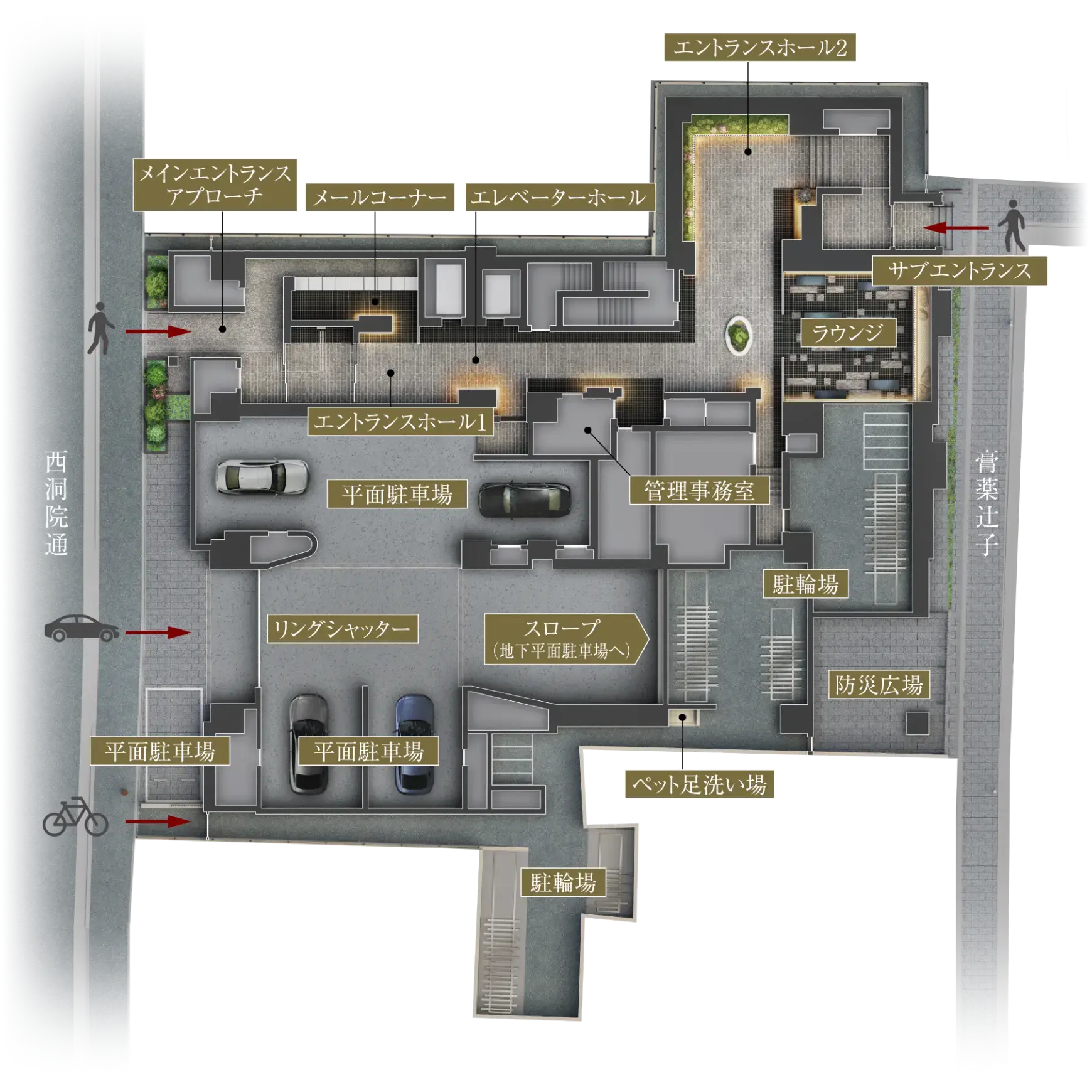 - 邸宅のグレード感を高める地下平面駐車場を16台(内来客用兼身障者用駐車場1台)、1階平面駐車場を5台ご用意。