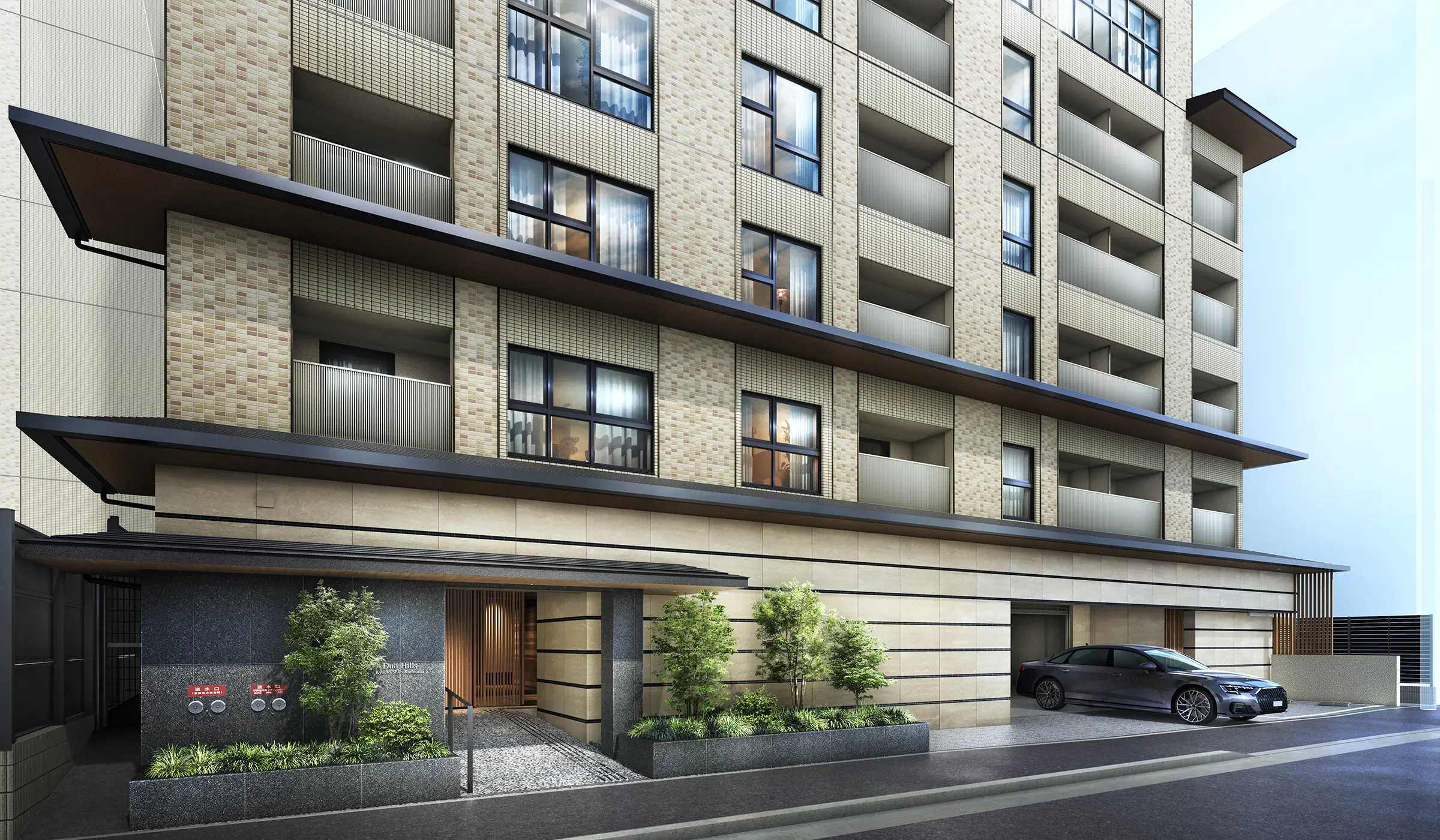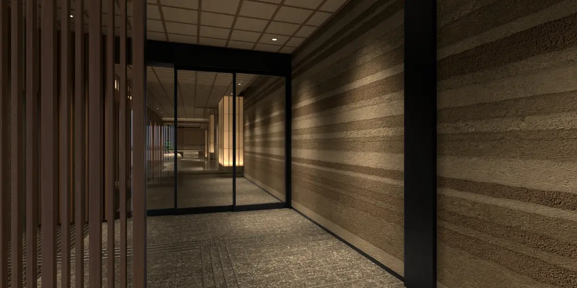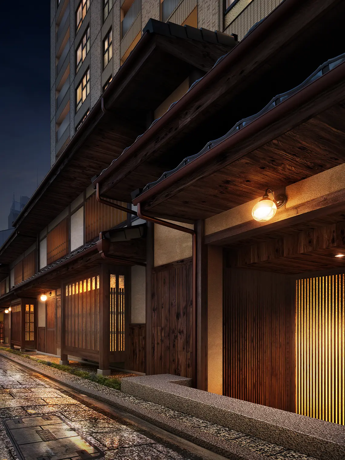 「時間」と「空間」の変化。 - メインエントランスをくぐり廊下を進むと庭の気配が現れ、やがてサブエントランスに繋がっていきます。この歩みの中で大切にしたのは「時間」と「空間」の移ろいです。古来より京都が育んできた手仕事、例えば格子木材、和紙、塗り壁などを現代的に進化させて配した美しい空間を、少しずつ歩を進めながら体験していく。帰宅時にはほっと癒され、自分が愛する京都の歴史と文化の中に身を置く喜びに浸ることができます。そうした時間と空間を、ぜひ提供したいと考えています。