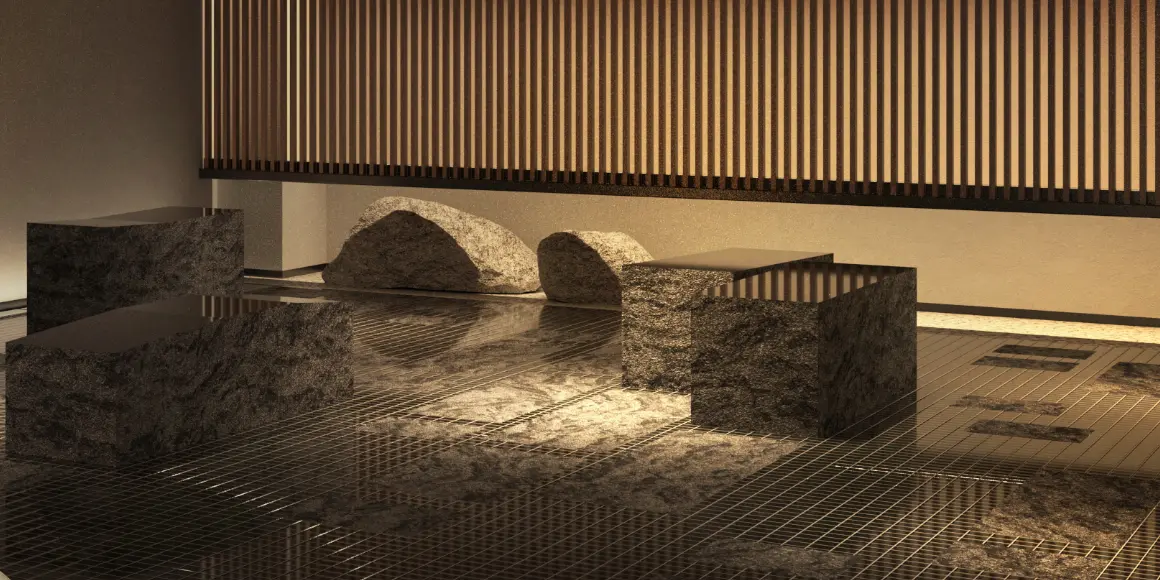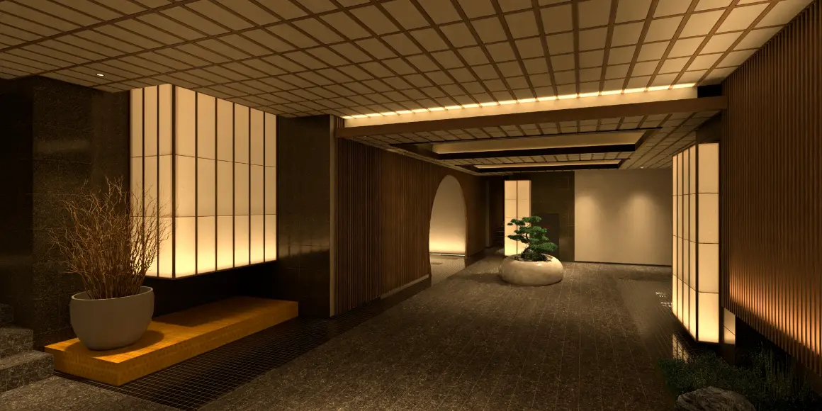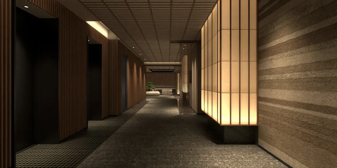 - エントランス空間は、千年を超え培われてきた京都の通り庭のように、歩くにつれて次の情景が展開していくドラマ性を創出しました。まず正面の壁で視線を受け止め、そこから角を連ねるように奥行きを重ね、やがて行燈の光がやさしく迎え入れます。人間のサーカディアンリズムにも順応するほのかな光、が天井や床にぼんやりと映り込み、空間の広がりを感じさせます。行燈の光に導かれるように進むと、柔らかな光に包まれたラウンジに至る。その光のシークエンスも大事にしました。