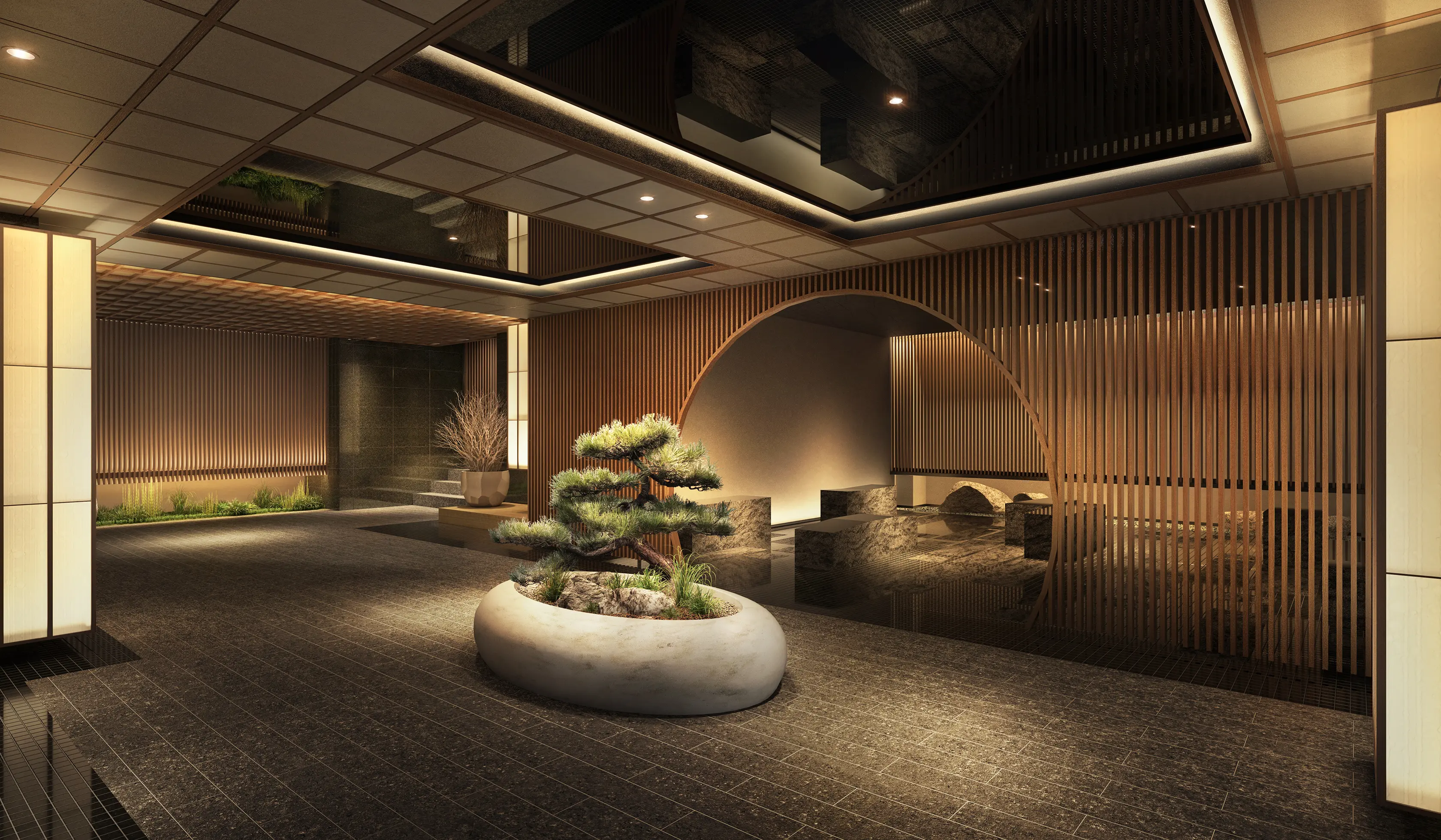 さらにその先には枯山水の趣を湛えた迎賓のラウンジ。