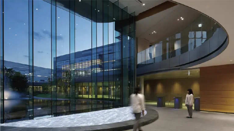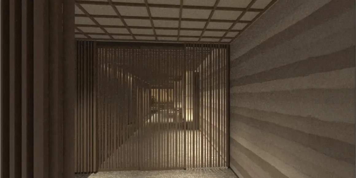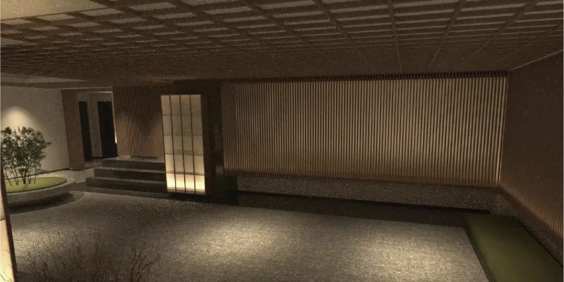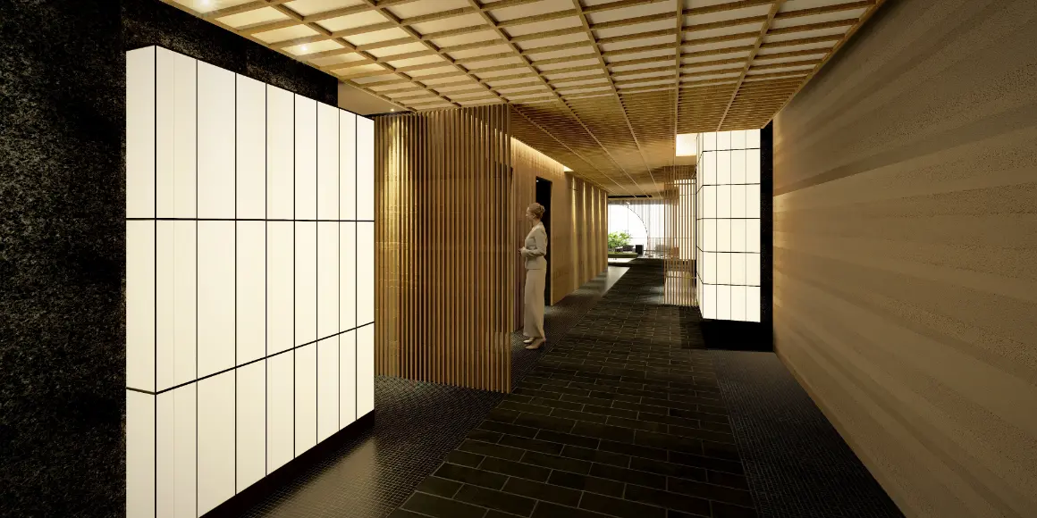 - エントランス空間は、千年を超え培われてきた京都の通り庭のように、歩くにつれて次が展開するというドラマ性を創出しました。まず正面の壁で視線を受け止め、そこから角を連ねるように奥行きを重ね、やがて行燈の光が迎え入れる。人間のサーカディアンリズムのサイクルにも順応するほのかな光が天井や床にぼんやりと映り込み、空間の広がりを感じさせます。行燈によって導かれていくと、柔らかい光で包まれたラウンジに到着する、その光のシークエンスも大事にしました。