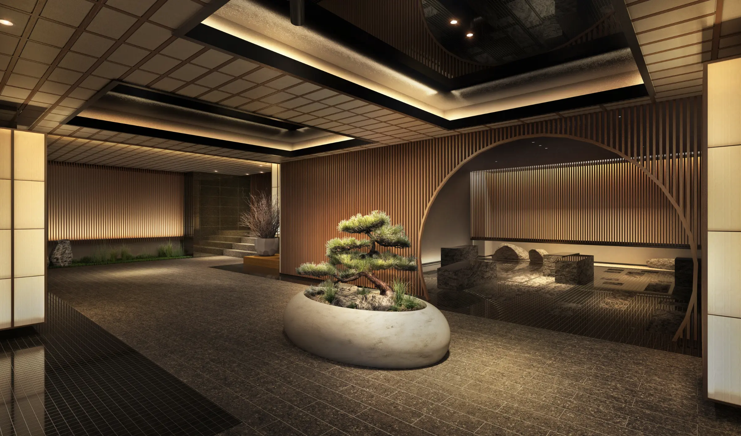 ラウンジ空間もエントランスと同様に奥行きを大切にしました。正面からまっすぐ入るのではなく、まず小さな庭を設け、漆のお盆に植物を活けたような景色を介して、満月を思わせる円形の入口へ誘います。縦格子に切り取られた円はまるで竹林の向こうに浮ぶ月のようで、ひとたびくぐれば、自然石のベンチが迎えるラウンジ空間が広がります。この対比が、京都の感性に通じる調和を生み出します。ここに座り、細やかに表情を整えられた枯山水の山のような石や砂紋を眺めながら一日を振り返る、あるいは住まう方同士が自然と会話を交わす—そんな一期一会の時間が生まれる場所を目指しました。自然の造形と人の技が互いを引き立て合うことで、空間は豊かな表情を宿します。建築は自然と人の協奏であり、その絶妙な均衡を整えることこそ私たち建築家の役割だと考えています。