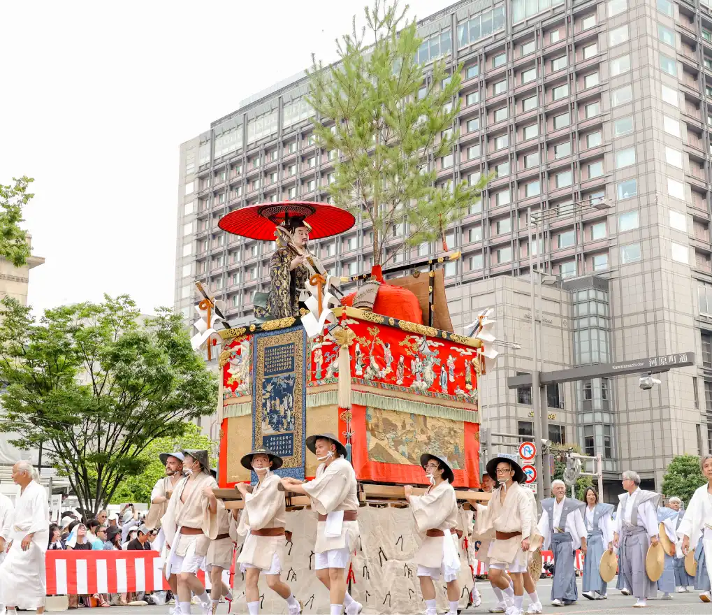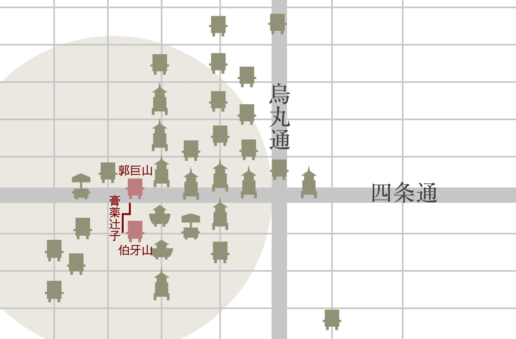 869年を起源とし、日本三大祭のひとつとして京の夏を彩る祇園祭。現地周辺は山鉾が立ち並ぶ中枢にあり、膏薬辻子の北には郭巨山、南には伯牙山、両端でお山建てが行われます。美麗な懸装品の表にも裏にも息づく職人の技、作事方の流れるような手仕事に、祇園祭を支える人々の熱を感じることができます。