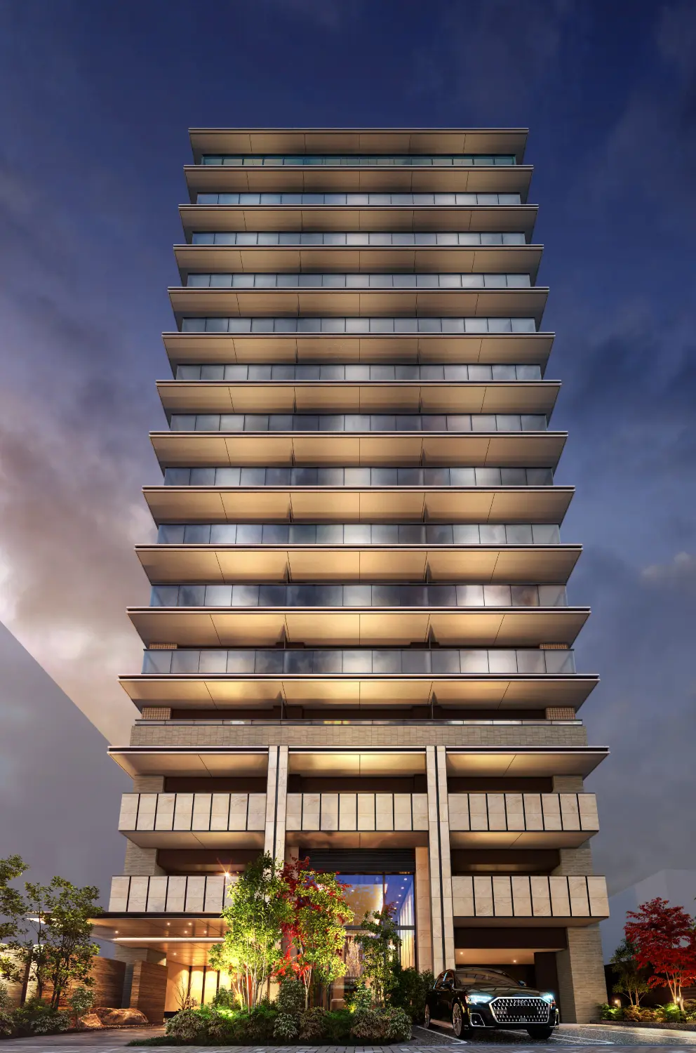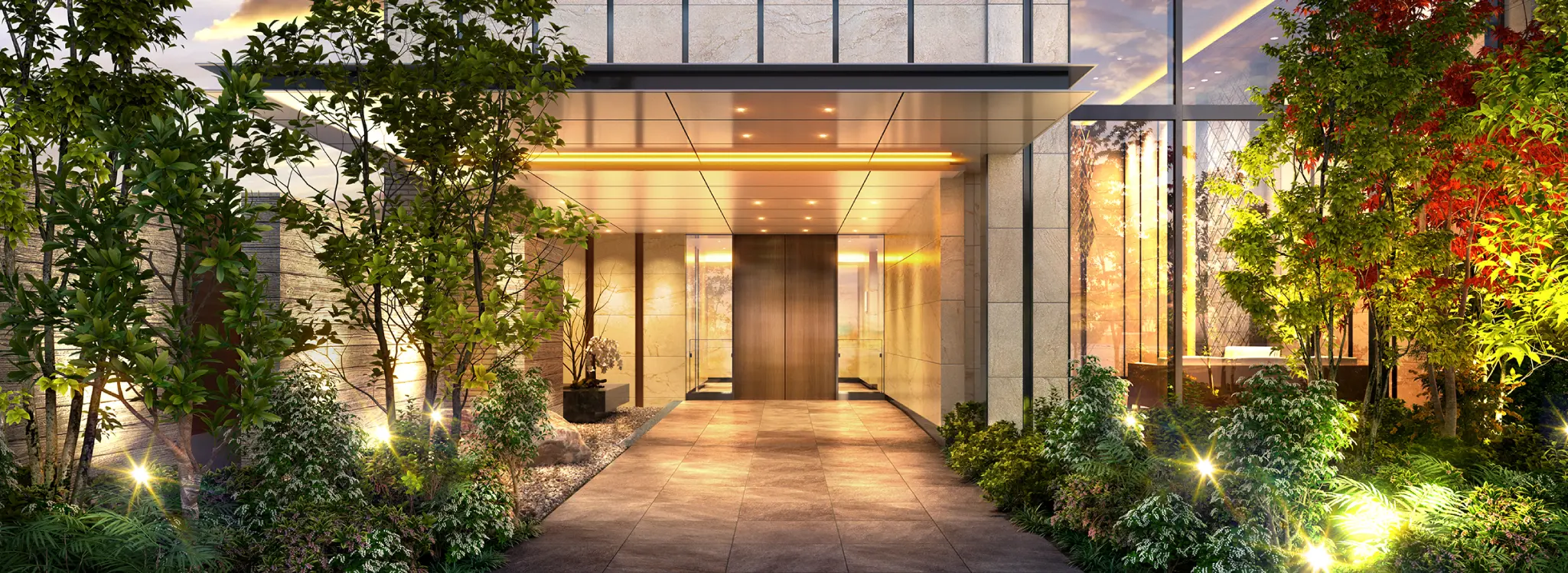 そして、左右に配された豊かな植栽が、ゆとりあるアプローチの先にあるエントランスへと導きます。