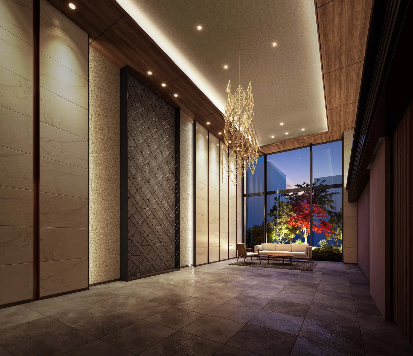 緑の植栽を借景にしたラウンジは、印象的な壁や天井から吊るされた組子をベースにしたアートなどにより、
