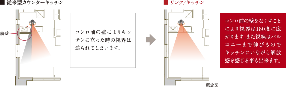 コンロ前の壁をなくしたことで開放的なキッチンを実現。ガラス製のディバイダー(油跳ね防止ガード)設置で安心。