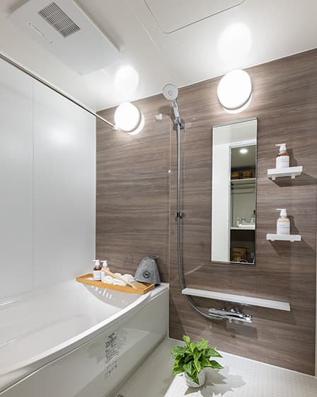 お湯張りから保温まで自動運転するオートバスシステム(追焚機能付)。リビングダイニングキッチンと浴室のリモコンから操作できます。