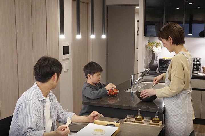 新型コロナウイルスの影響で、家にいる時間が増え、家族のコミュニケーションも大きく変わりました。そこで、家族で過ごす住空間にも変化が必要ではないかと考え、開発したのが「fitキッチン」です。キッチン=料理をする場所、ダイニング=食事をする場所という従来の発想を転換し、キッチン・ダイニングをひとつの空間としてとらえ、家族とつながるコミュニケーションの場として再構築。近年増える共働き夫婦の忙しい日々に配慮し、作業効率にも徹底的にこだわっています。